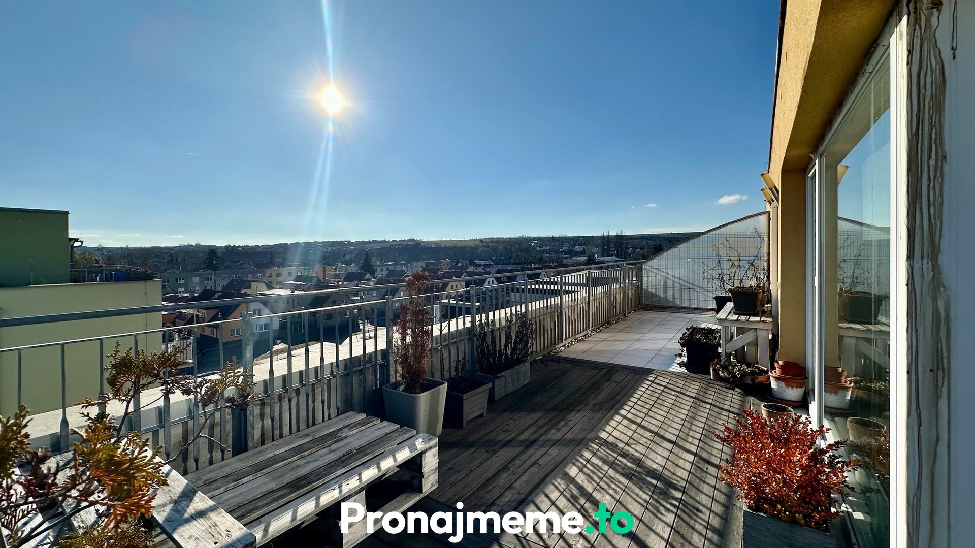 K pronájmu nabízíme výjimečný střešní byt 3+kk o podlahové ploše 85 m², který zaujme nejen svým moderním provedením, ale především velkorysou terasou o ploše 66 m², jež obepíná celý byt. Bydlení, které nabízí prostor, světlo, soukromí a atmosféru, jakou běžné byty jednoduše nemají.