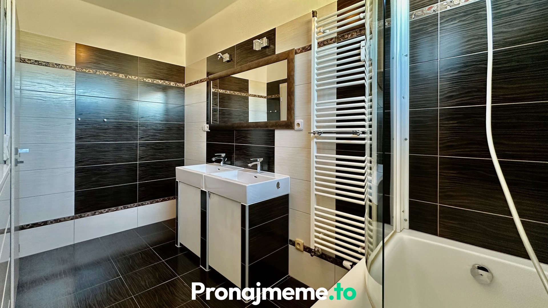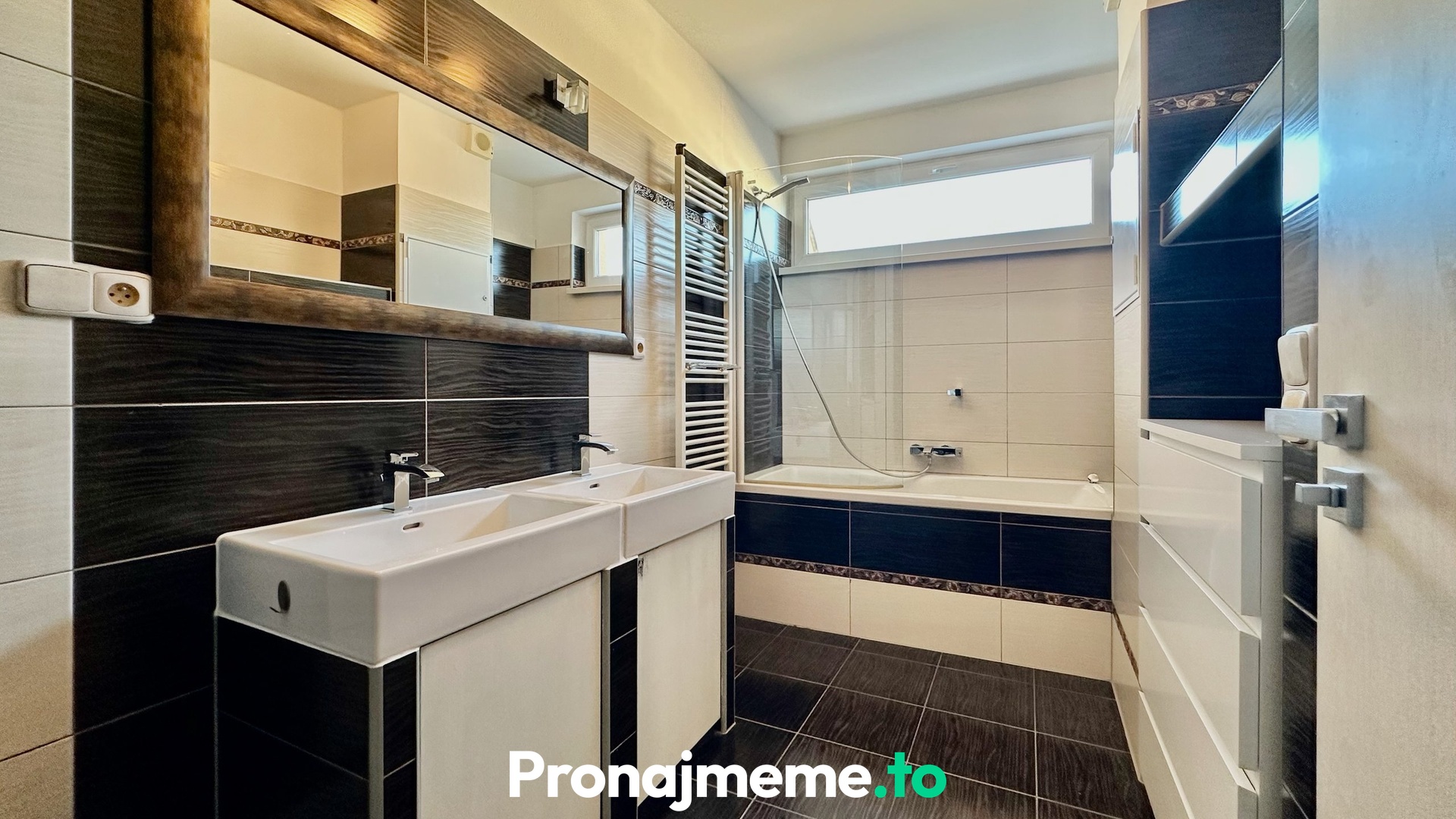 Koupelna je vybavena vanou, dvěma umyvadly a topným žebříkem. Velkým benefitem je okno, které zajišťuje denní světlo i přirozené větrání.