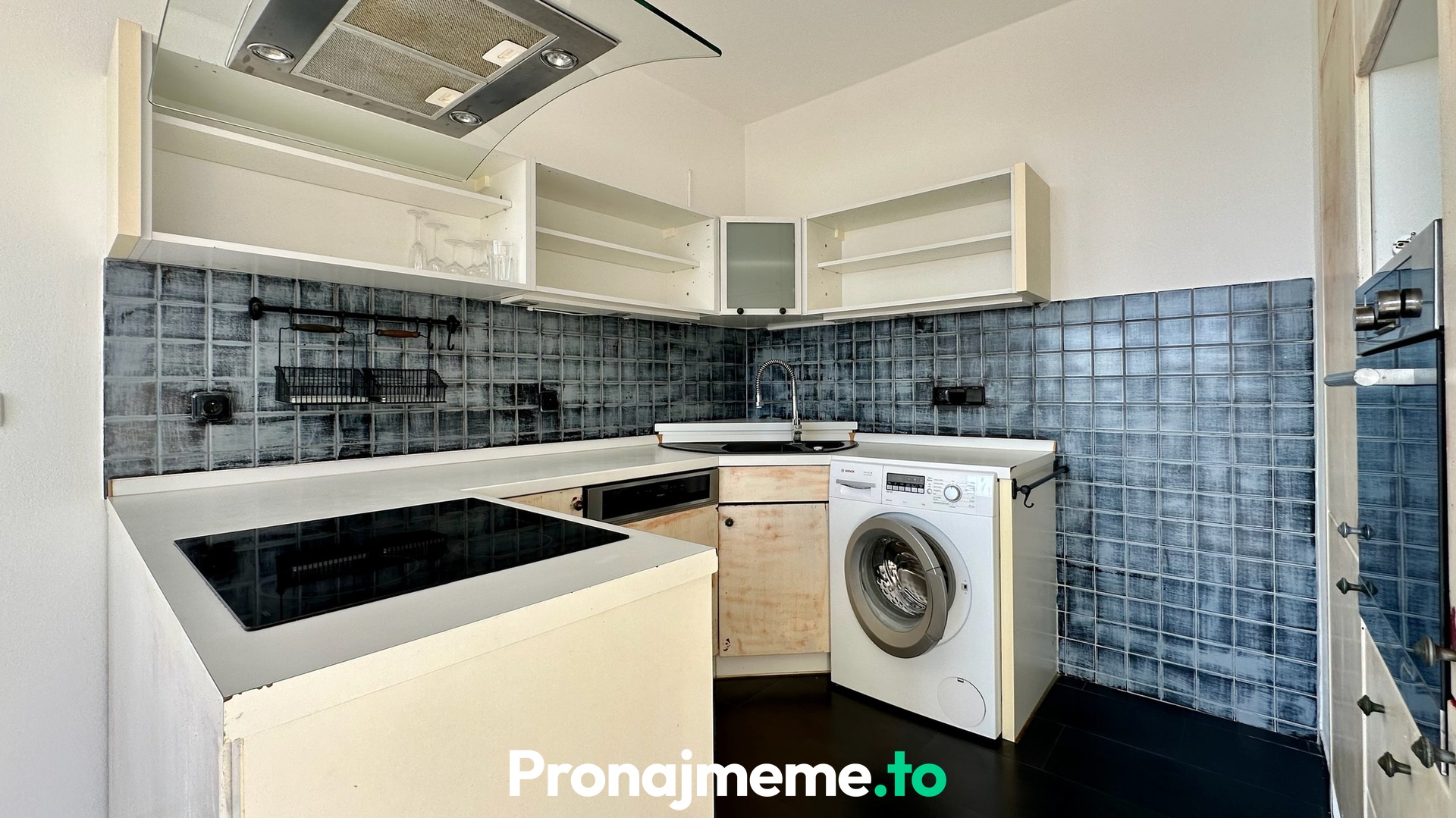 Kuchyňská část je vybavena plně zařízenou kuchyňskou linkou a od obývacího pokoje je oddělena elegantní příčkou, která zároveň slouží jako úložný prostor a v obývací části jako vkusná televizní stěna.