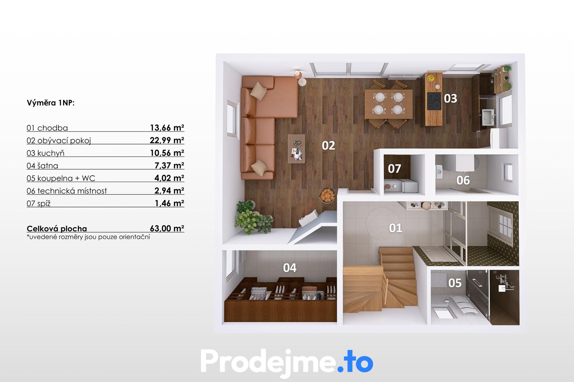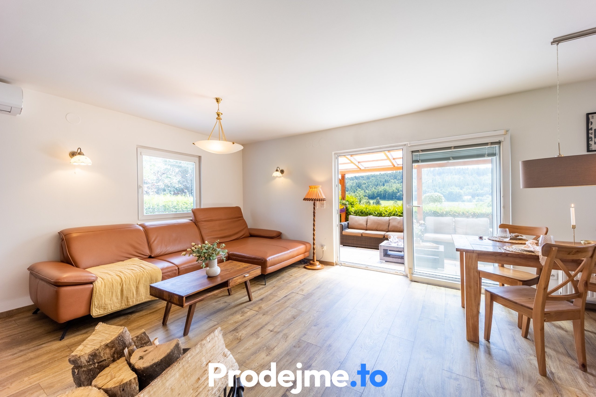 Dům je dvoupodlažní s prostornou půdou. Přízemí patří velkému obývacímu pokoji se stylovými kamny a plně vybaveným kuchyňským koutem. Příjemnou atmosféru a prosvětlenost dodávají místnosti francouzská okna na terasu. Díky zastřešení, orientaci na jihovýchod a nádhernému výhledu do údolí je posezení na terase opravdovým odpočinkem. V přízemí dále najdete praktickou spíž, koupelnu se sprchovým koutem a toaletou, technickou místnost s elektrickým bojlerem, pračkou a sušičkou a také velkou šatnu, kterou lze, díky umístěnému oknu, využít jako další samostatný pokoj.