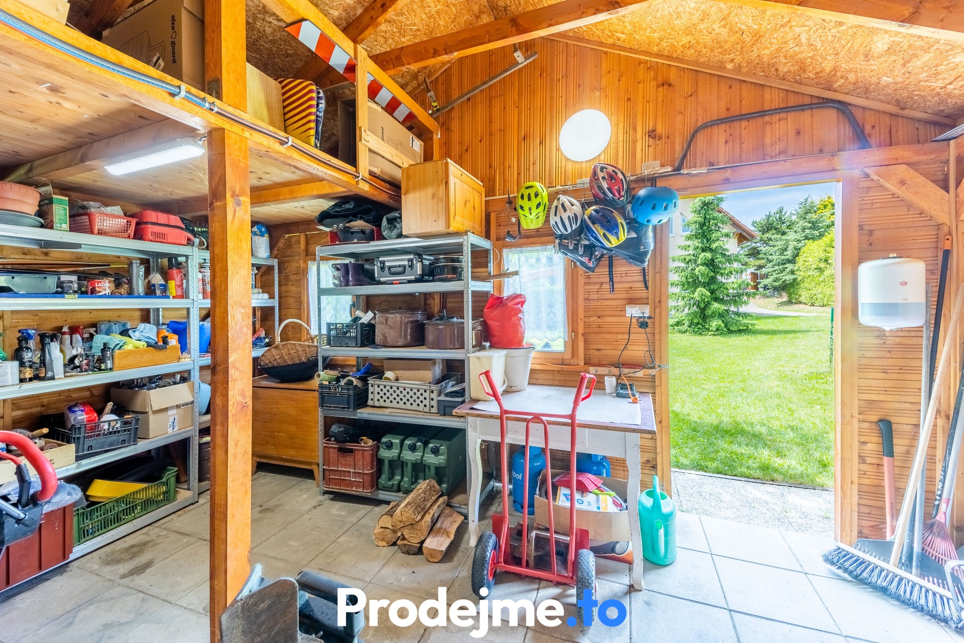 Úložné prostory doplňuje zahradní domek umístěný v rohu zahrady, dokonce vybavený přívodem vody. Díky své velikosti pojme veškeré zahradní vybavení, nářadí i sezónní věci jako jsou kola či lyže.