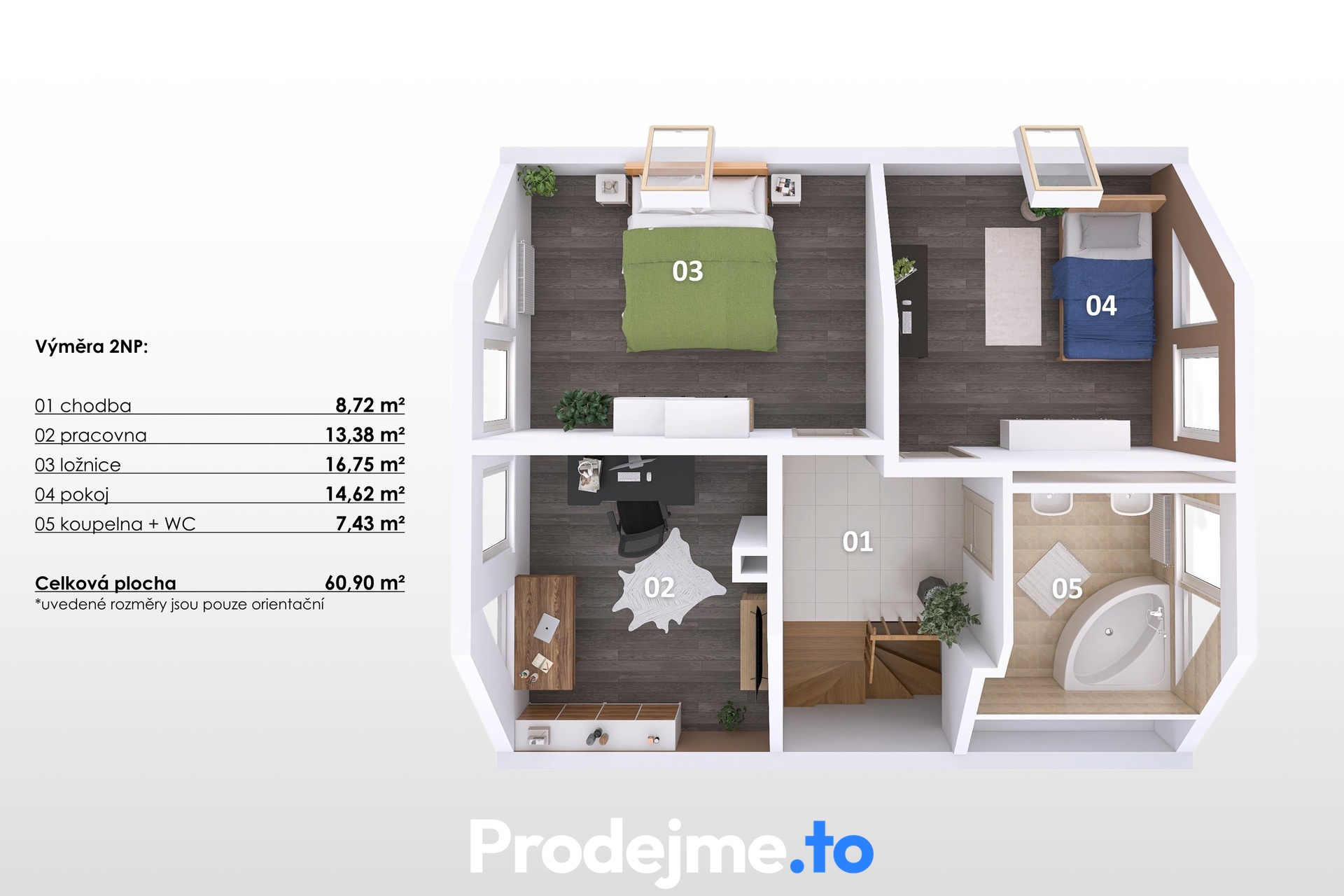 Patro disponuje pracovnou, ložnicí a dětským pokojem. Pro větší pohodlí nabízí druhou koupelnu s rohovou vanou, 2 umyvadly a toaletou. Z chodby se dostanete na prostornou půdu, která poskytuje velké úložné prostory a možnost rozšíření o další obytné místnosti.