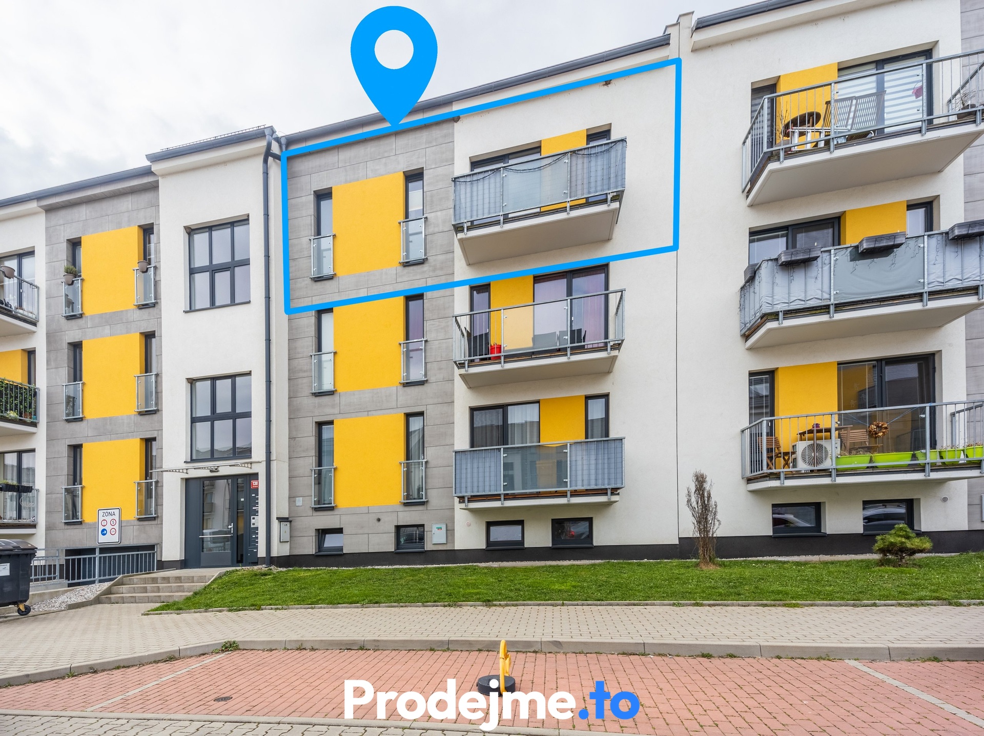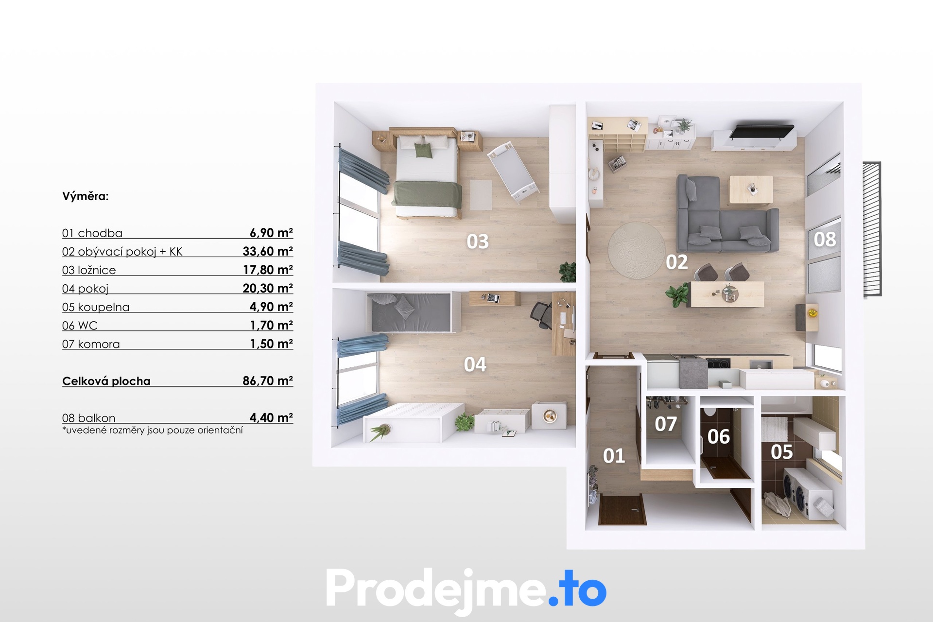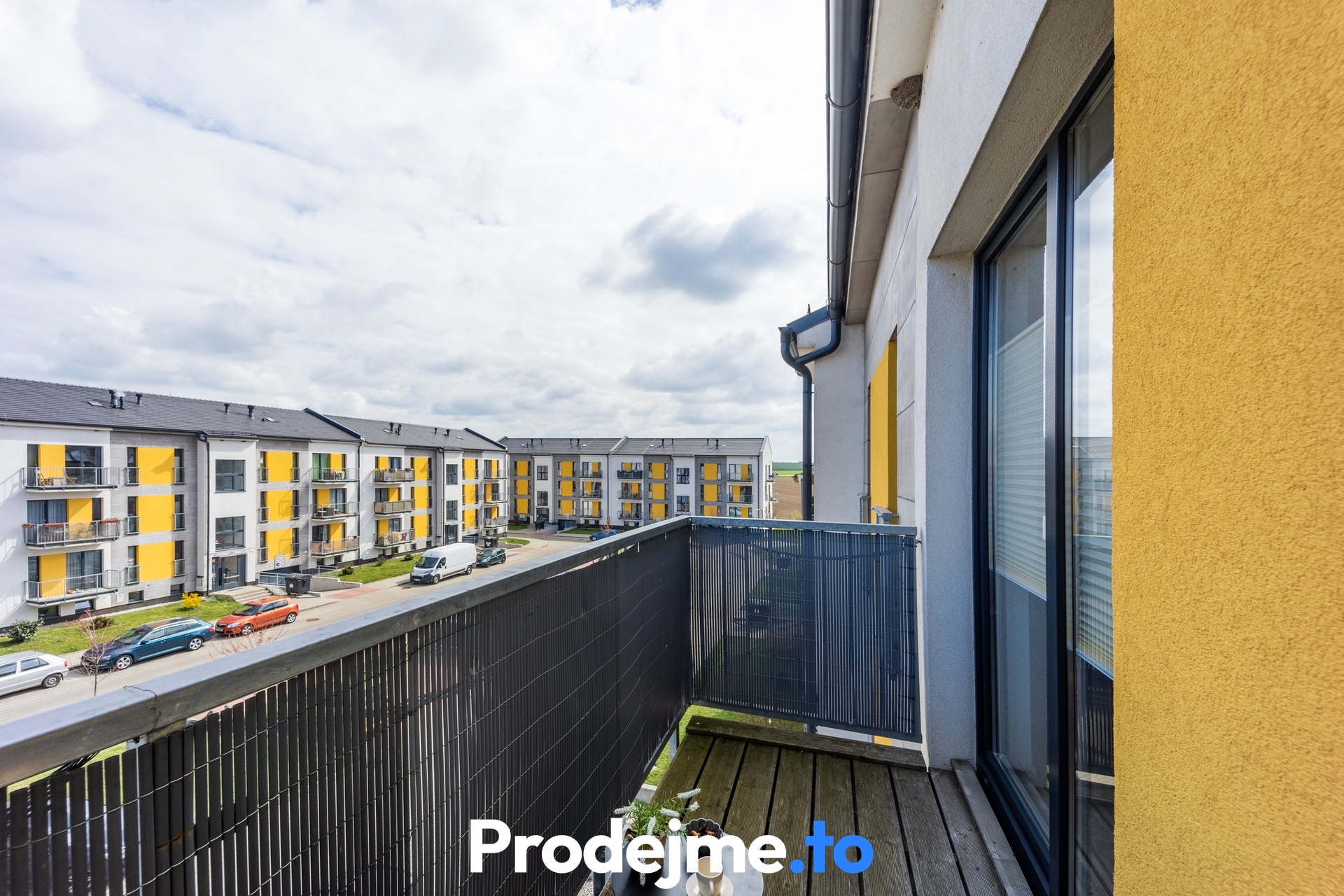 Obývací pokoj je propojený s kuchyní na míru, kde nechybí praktický ostrůvek – skvělé místo pro rychlé snídaně, večerní posezení nebo společné vaření. Odsud také vstoupíte na balkón. Ložnice i dětský pokoj orientované do zeleně vytvářejí pocit klidu i příjemného soukromí. Koupelna je vybavená vanou, umyvadlem a zrcadlem a počítá i s místem na pračku se sušičkou. Samostatná toaleta má vlastní malé umyvadlo. Praktickou součástí bytu je také komora s posuvnými dveřmi – ideální na zásoby a domácí potřeby, které chcete mít po ruce, ale ne na očích.