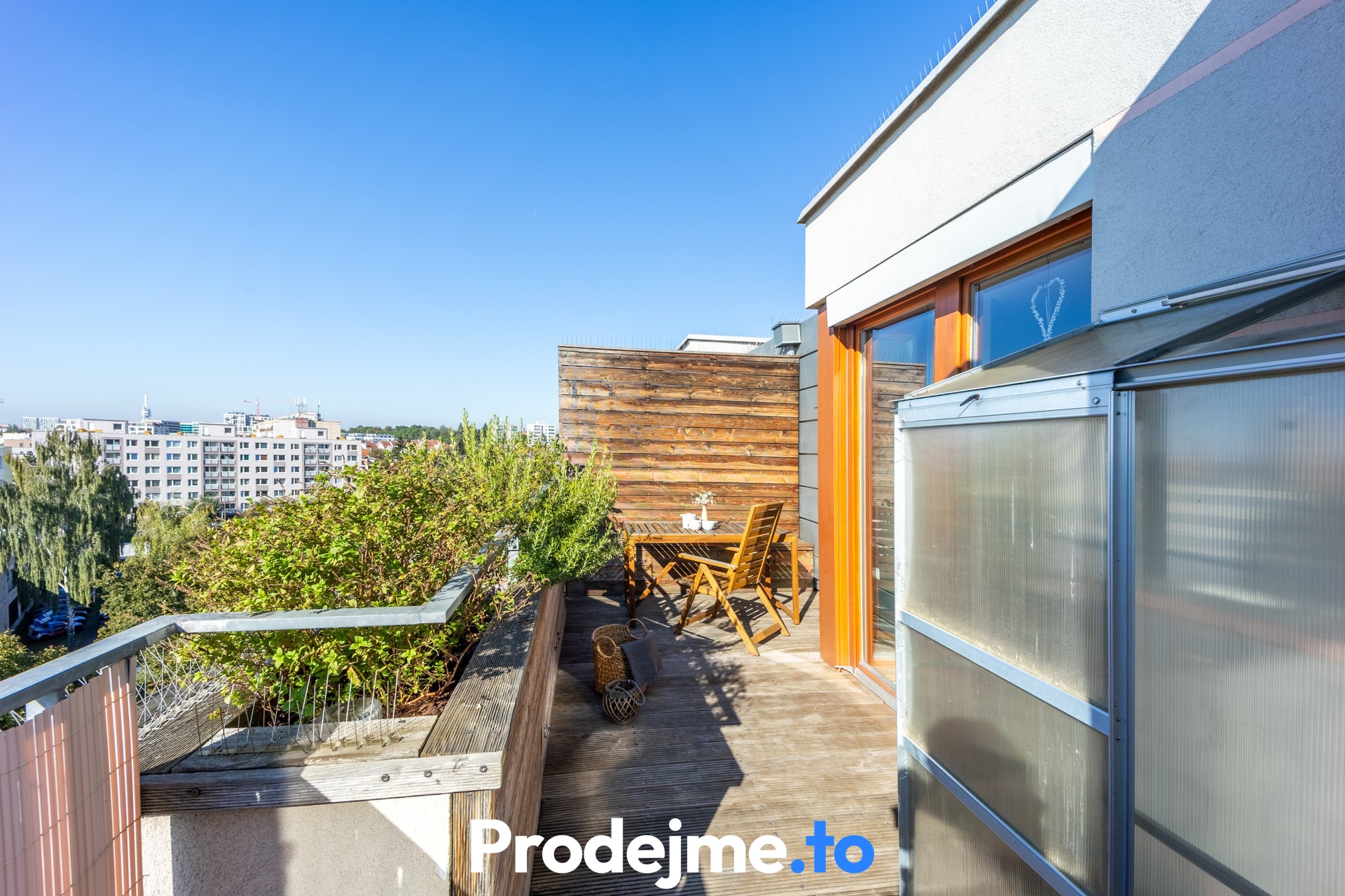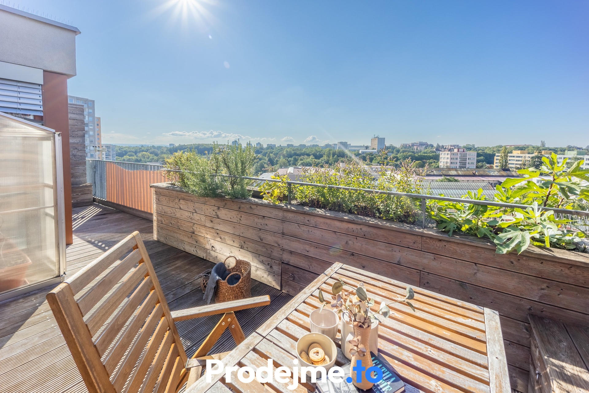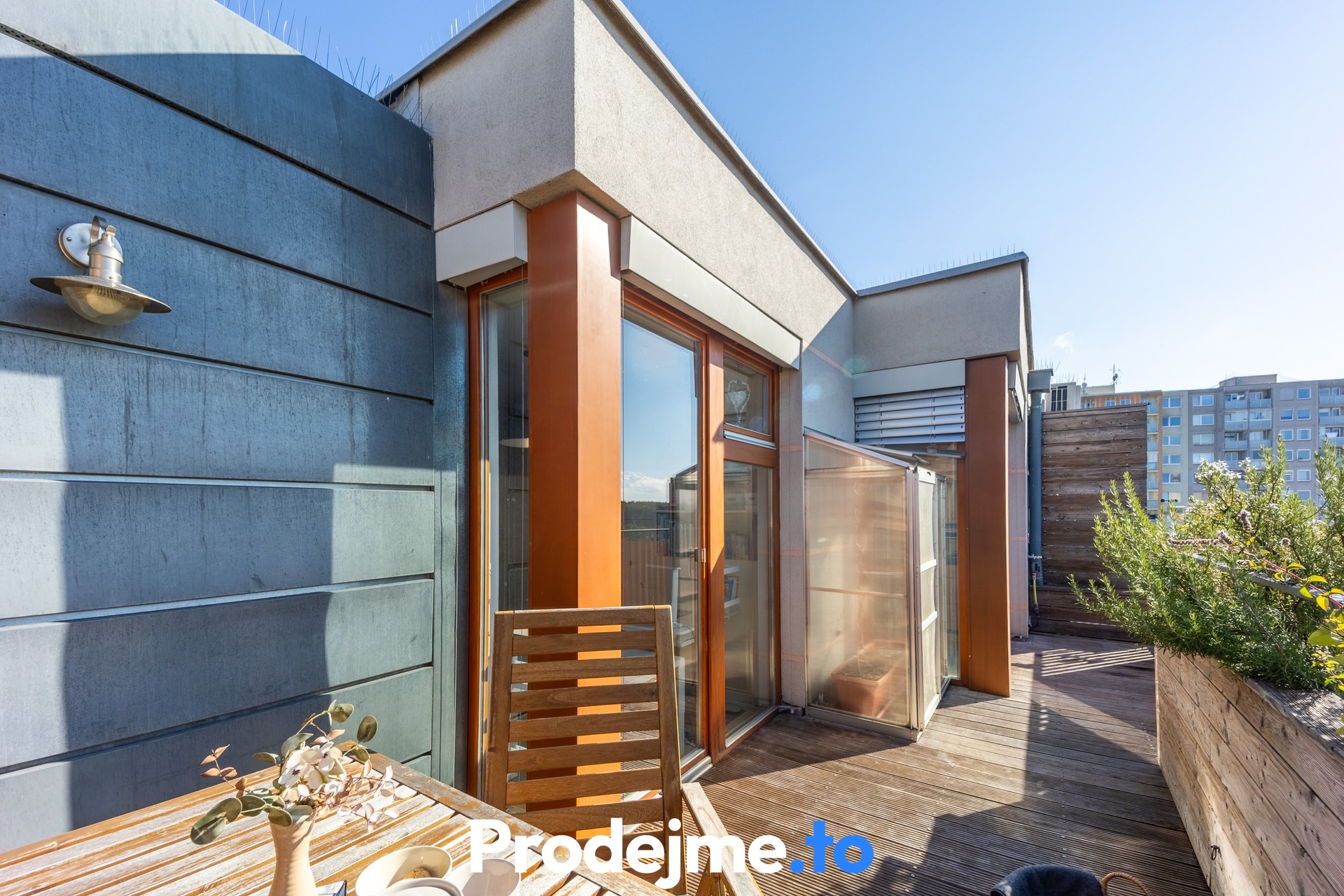 Velkým bonusem tohoto bytu jsou dvě prostorné terasy s dřevěným obložením. Severní terasa o 14,5 m2 je ideální pro klidné posezení ve stínu, jižní o velikosti 18,2 m2 vám zase dopřeje slunce po celý den. Můžete si tak vybrat podle nálady i denní doby. Kromě relaxace na čerstvém vzduchu ocení nadšení pěstitelé i malý skleník a truhlíky s automatickou závlahou, které dotvářejí příjemnou atmosféru.