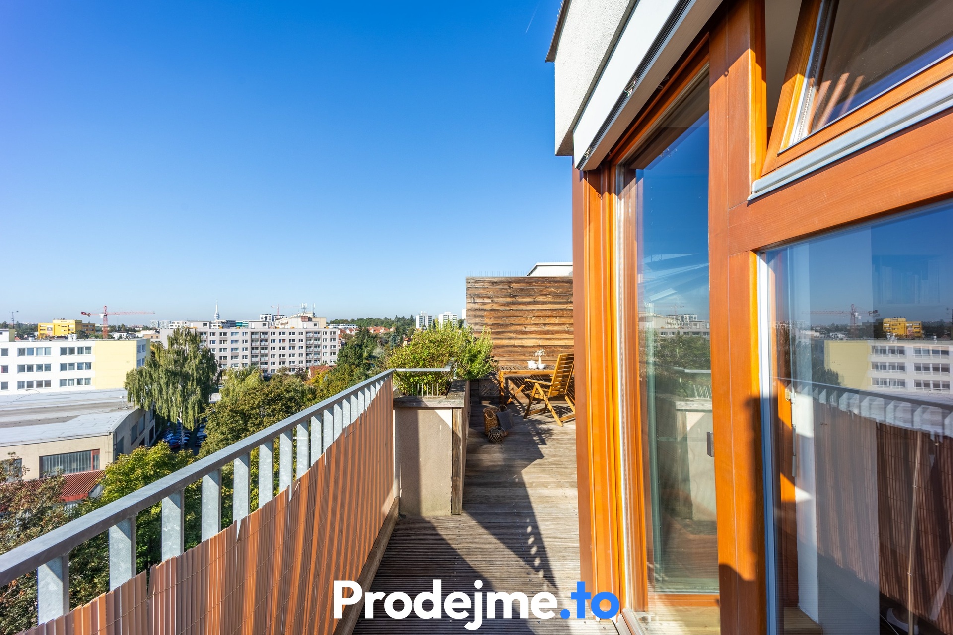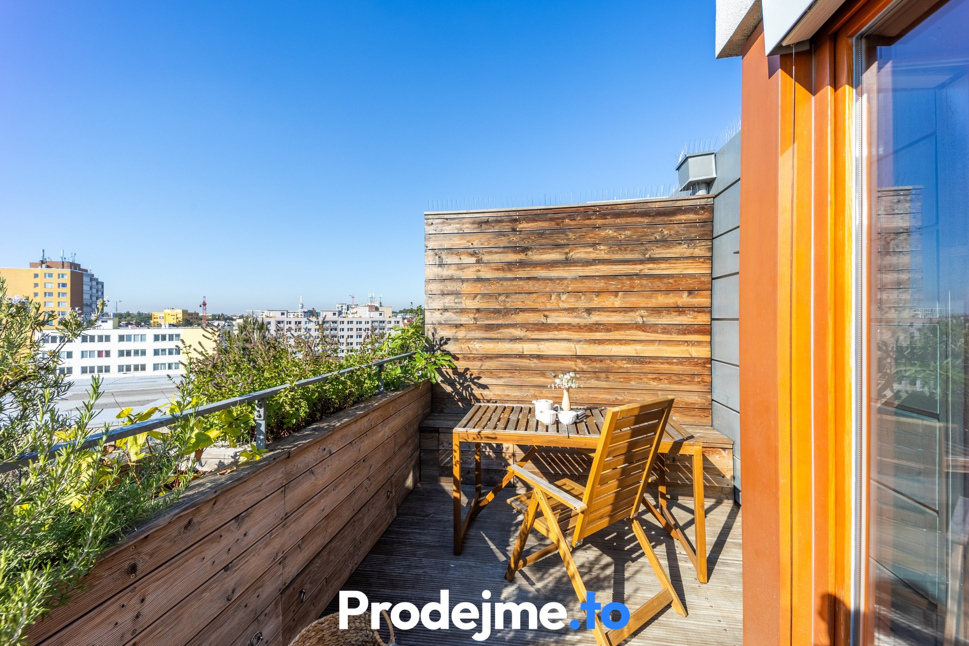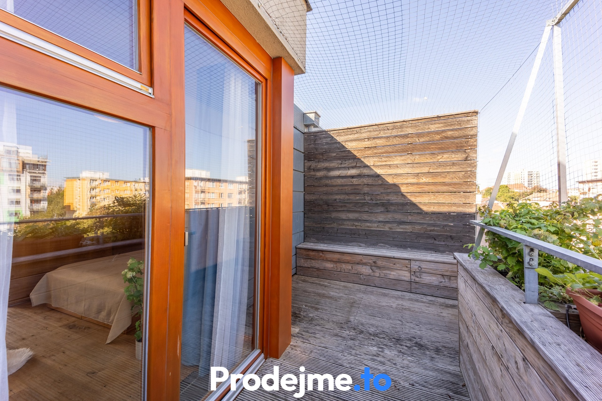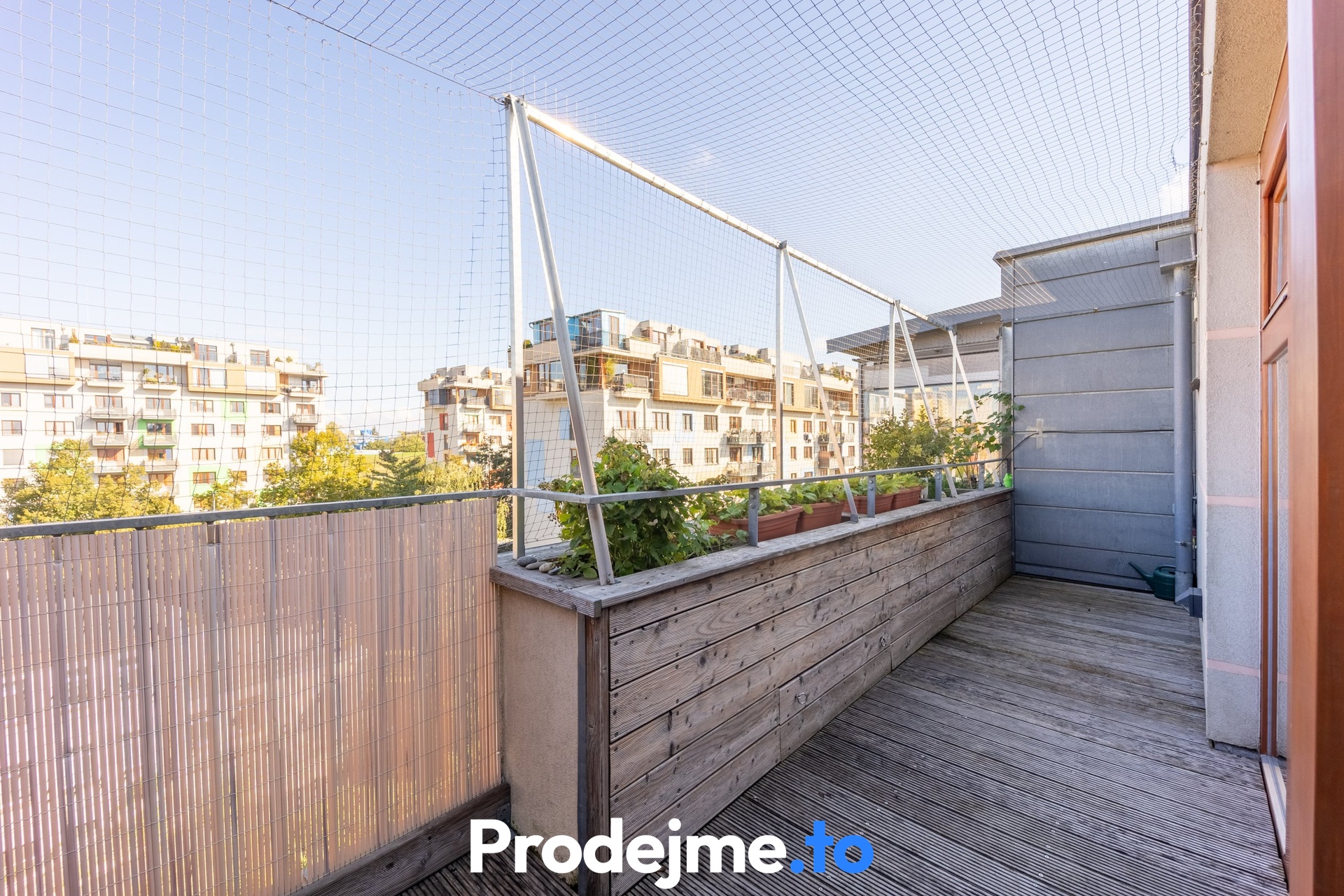 Velkým bonusem tohoto bytu jsou dvě prostorné terasy s dřevěným obložením. Severní terasa o 14,5 m2 je ideální pro klidné posezení ve stínu, jižní o velikosti 18,2 m2 vám zase dopřeje slunce po celý den. Můžete si tak vybrat podle nálady i denní doby. Kromě relaxace na čerstvém vzduchu ocení nadšení pěstitelé i malý skleník a truhlíky s automatickou závlahou, které dotvářejí příjemnou atmosféru.