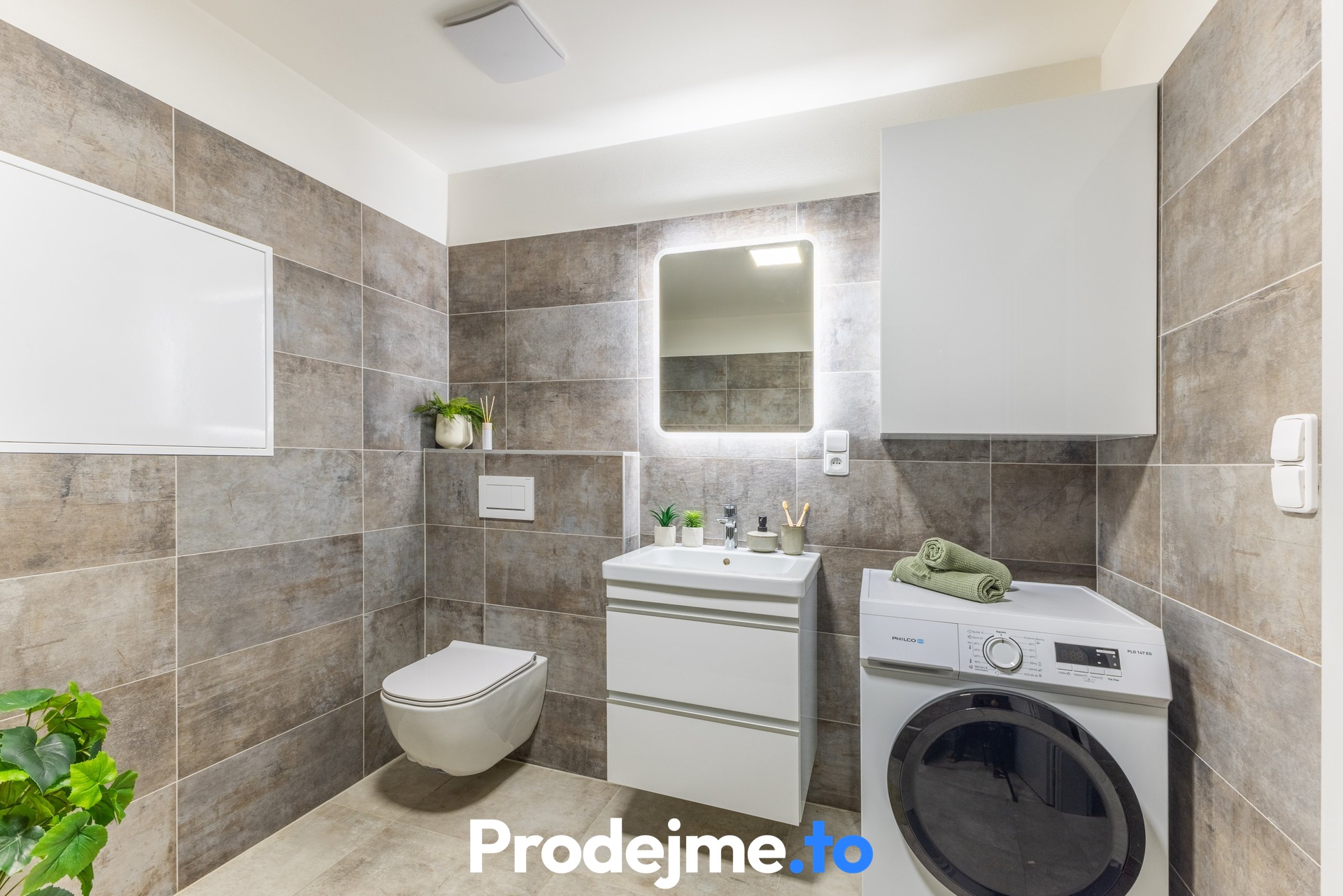 Koupelna je vybavena vanou, toaletou, umyvadlem, pračkou a dvěma otopnými žebříky. O úložné prostory je postaráno díky vestavné skříni na míru v chodbě a vlastnímu sklepu o velikosti 2,5 m2 v suterénu domu.