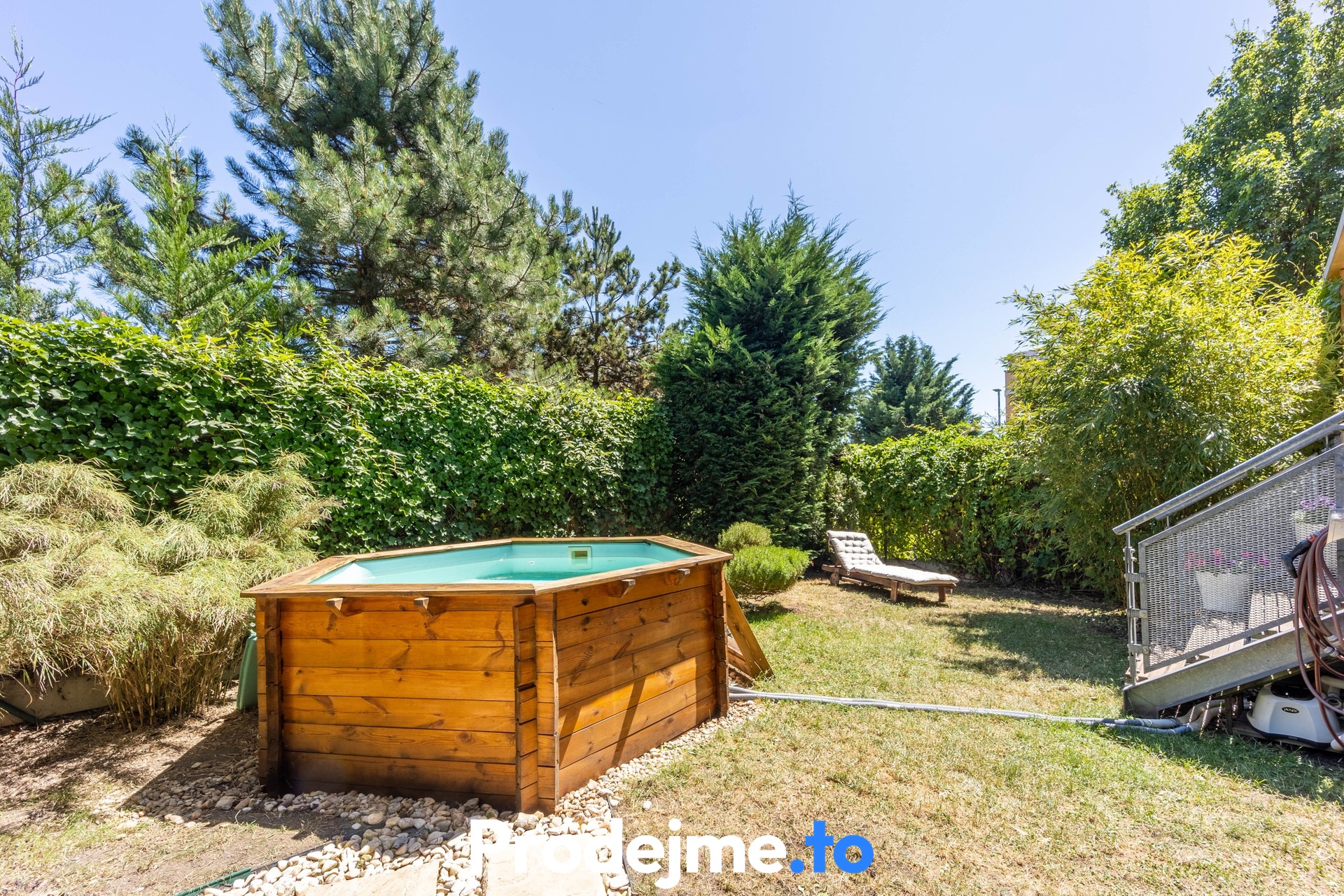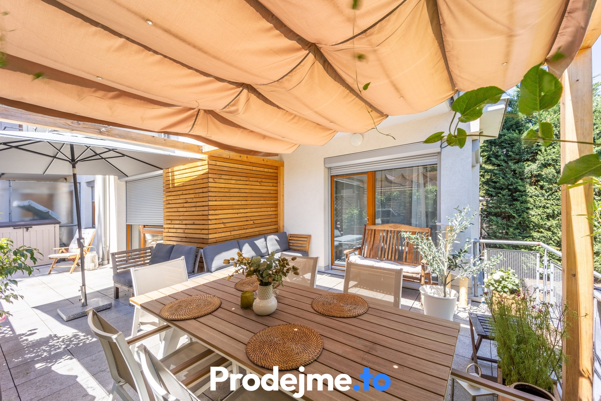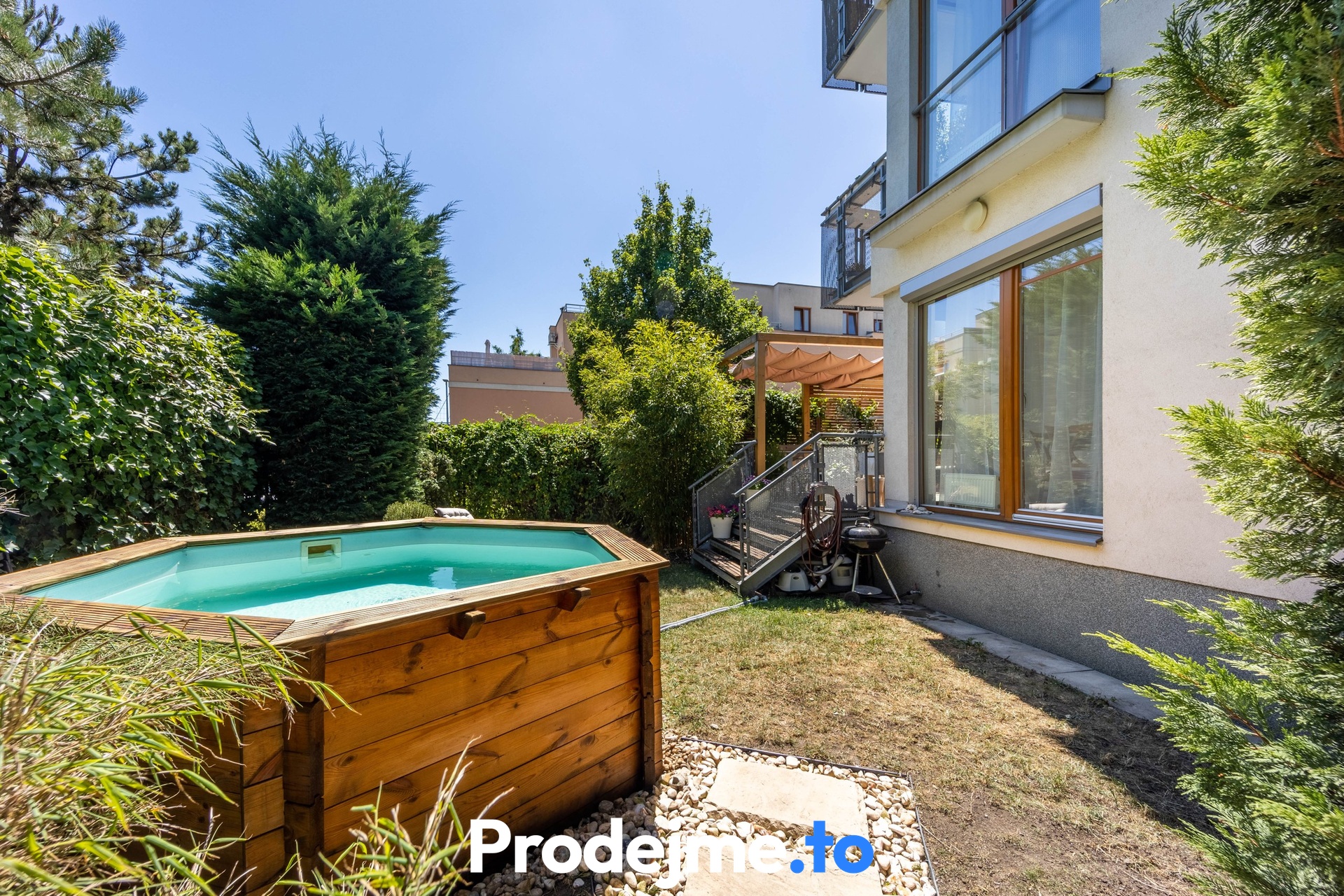 Tady si můžete užívat volný čas venku, aniž byste opustili domov. Terasa díky své velikosti 41,68 m2 nabídne místo pro zahradní posezení, gril i okrasné květiny. Dokonalost podtrhuje dřevěná pergola s látkovou markýzou a vstup na vlastní předzahrádku. Ta má 65 m2, je oplocená a porostlá zelení poskytující soukromí. Příjemným bonusem je bazén s průměrem 2,9 m včetně filtrace a solinátoru.