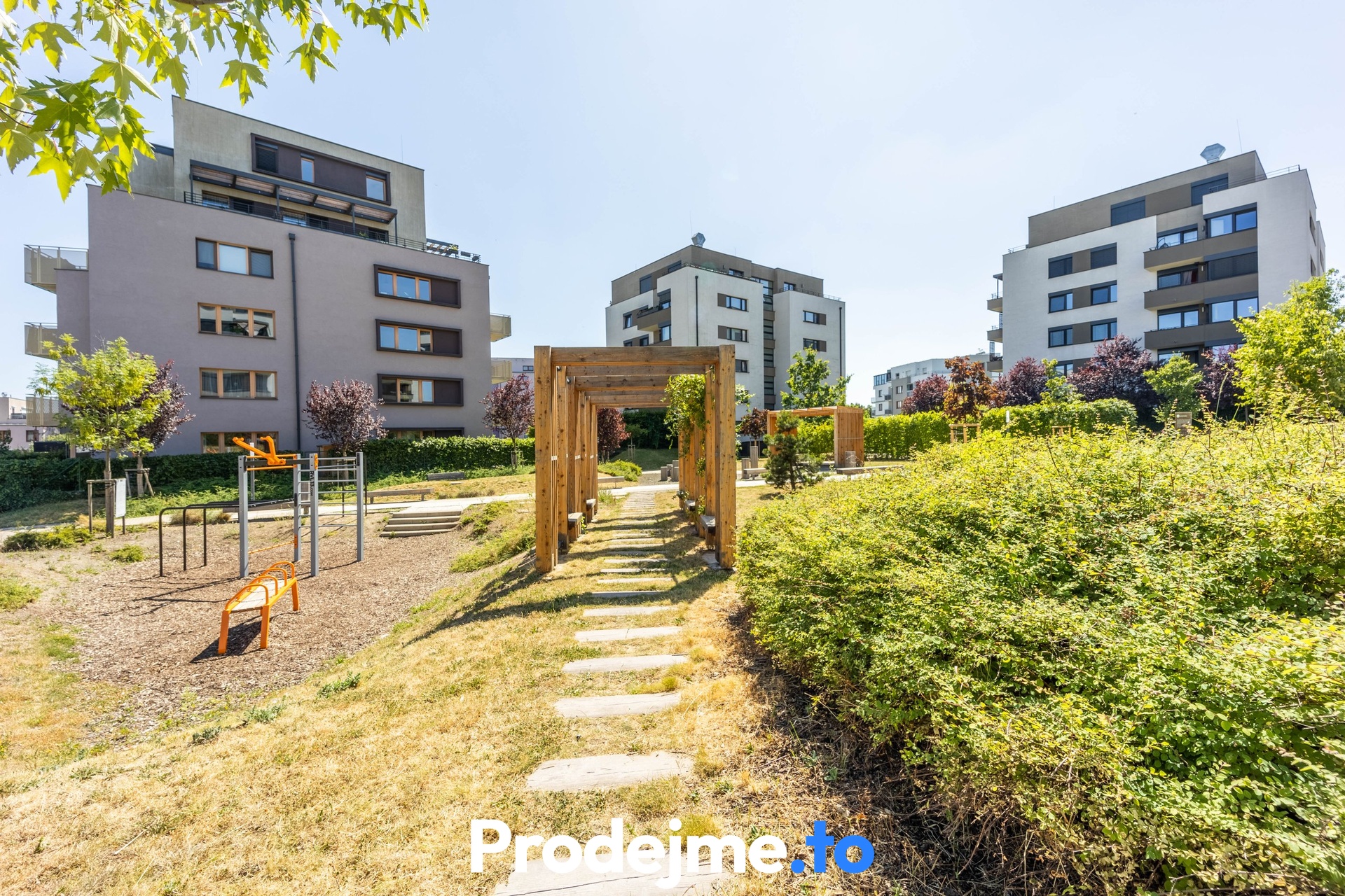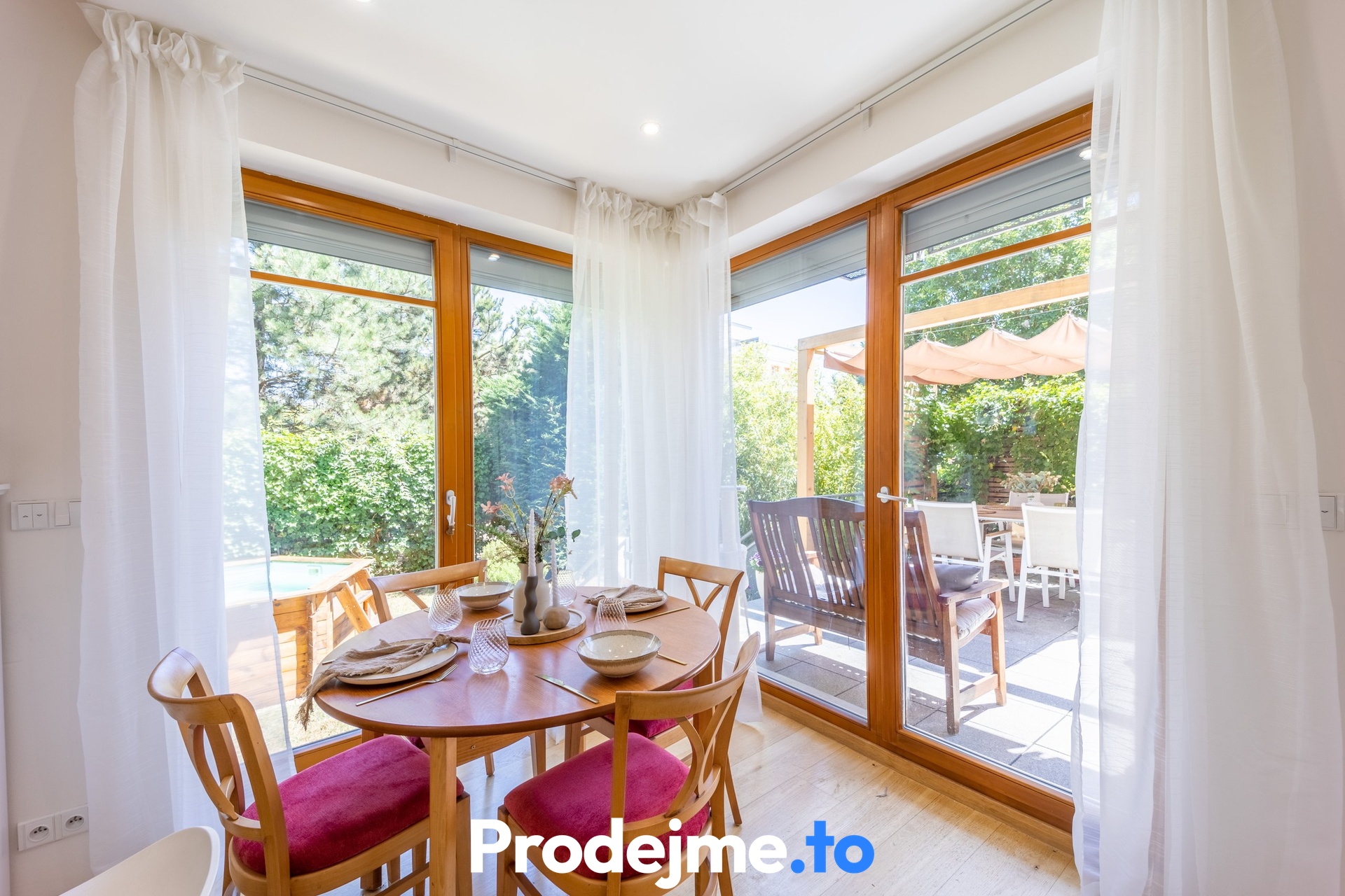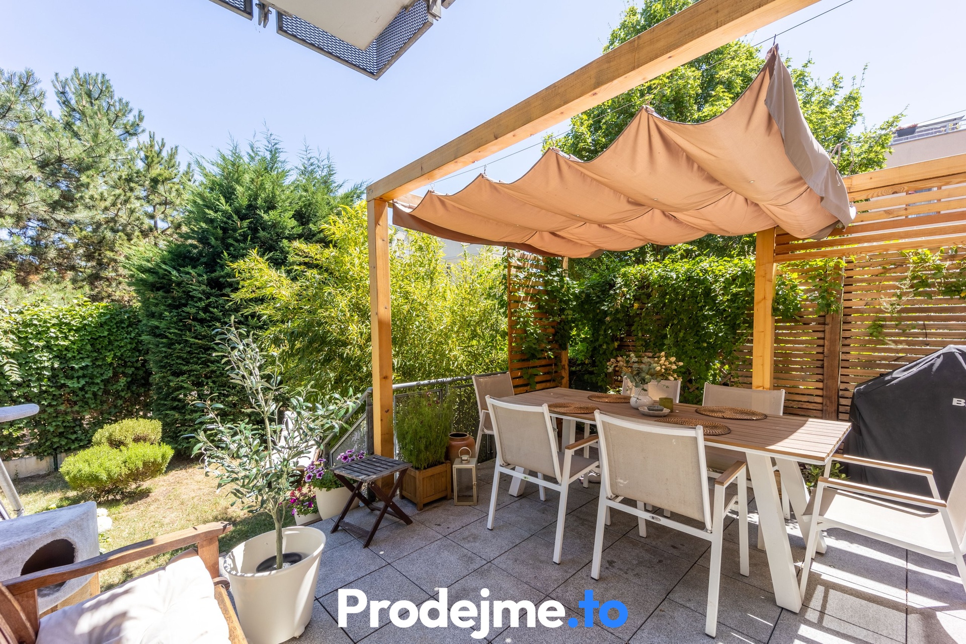Tady si můžete užívat volný čas venku, aniž byste opustili domov. Terasa díky své velikosti 41,68 m2 nabídne místo pro zahradní posezení, gril i okrasné květiny. Dokonalost podtrhuje dřevěná pergola s látkovou markýzou a vstup na vlastní předzahrádku. Ta má 65 m2, je oplocená a porostlá zelení poskytující soukromí. Příjemným bonusem je bazén s průměrem 2,9 m včetně filtrace a solinátoru.
