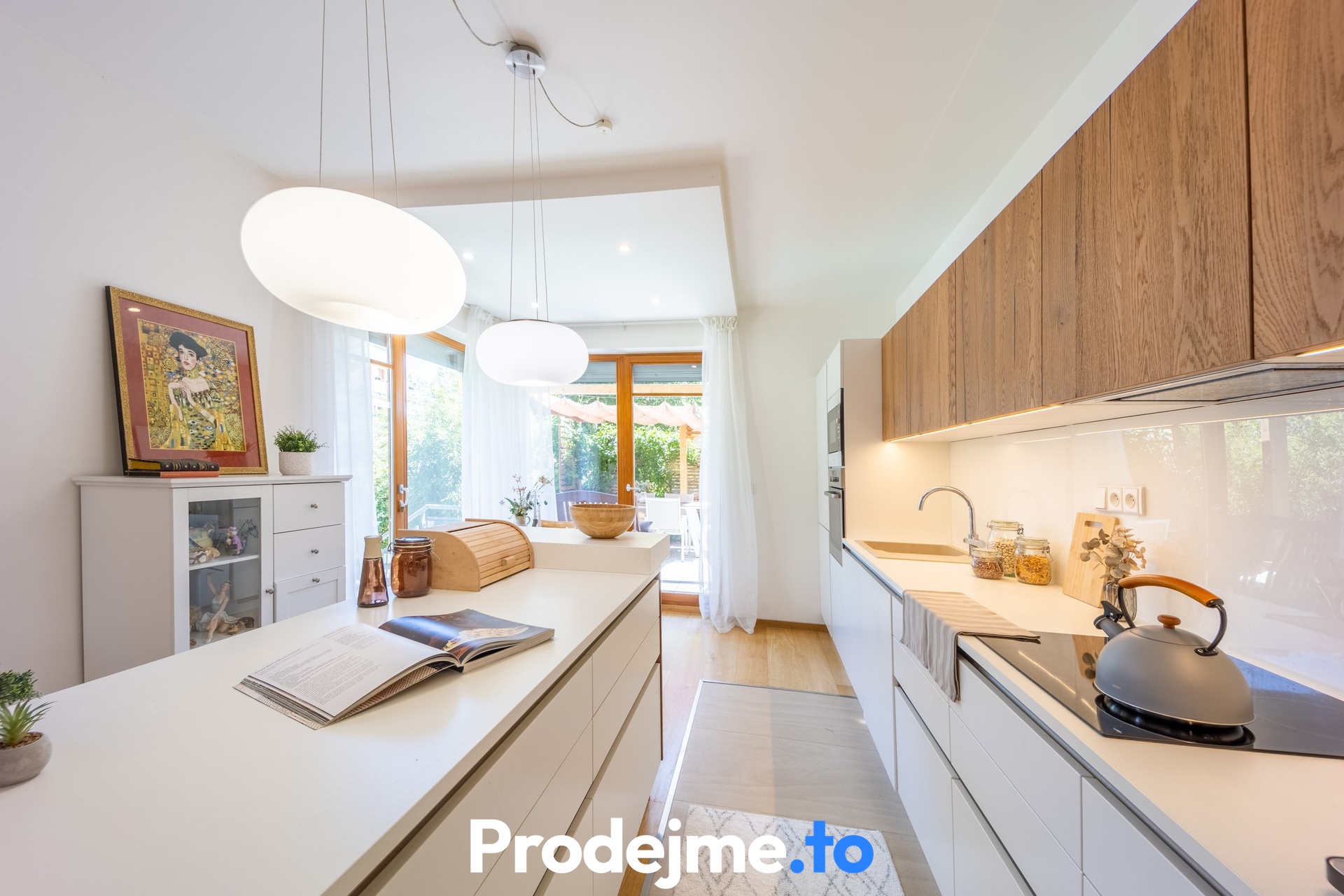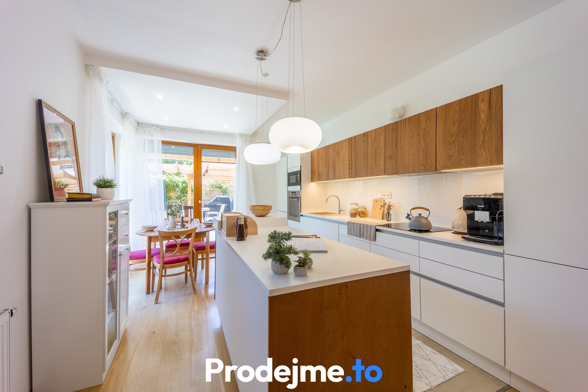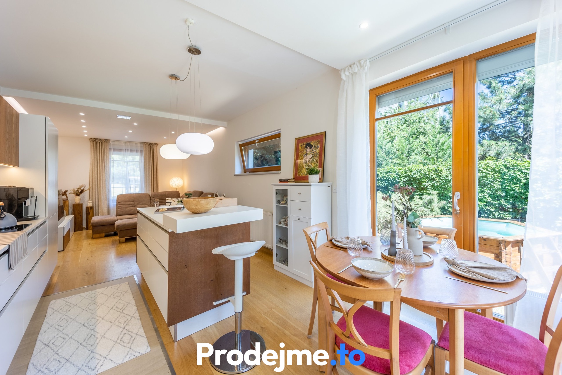 Jako celek ale funguje skvěle, uznejte sami. Vše začíná v obývacím pokoji s velkou kuchyňskou linkou a ostrůvkem. Díky francouzským oknům a vstupům na terasu i do předzahrádky je celý prostor naplněný sluncem. Příjemnou atmosféru díky dostatku denního světla si užijete také v dětském pokoji a ložnici. V té vás potěší vlastní vstup na terasu. Klid na práci vám dopřeje pracovna, kterou ale můžete v případě potřeby snadno využít jako další dětský pokoj. Vkusná koupelna disponuje 2 umyvadly, sprchou a rohovou vanou. Pračku se sušičkou a potřebami pro úklid umístíte do praktické komory. Toalety jsou k dispozici dvě.