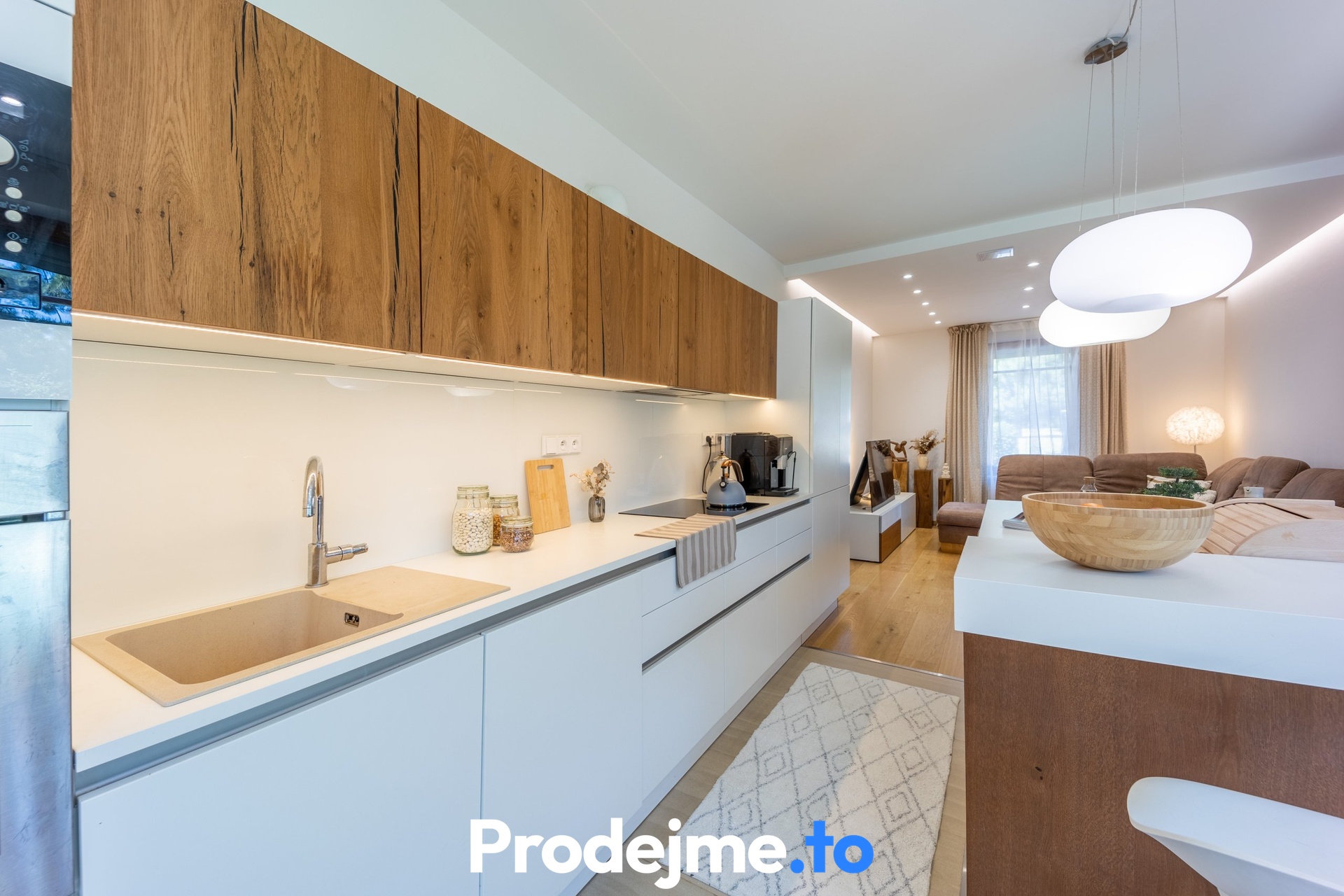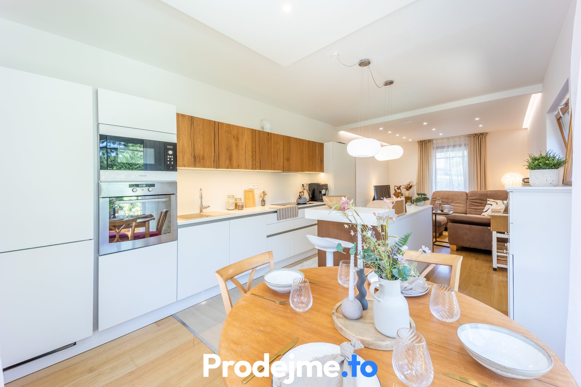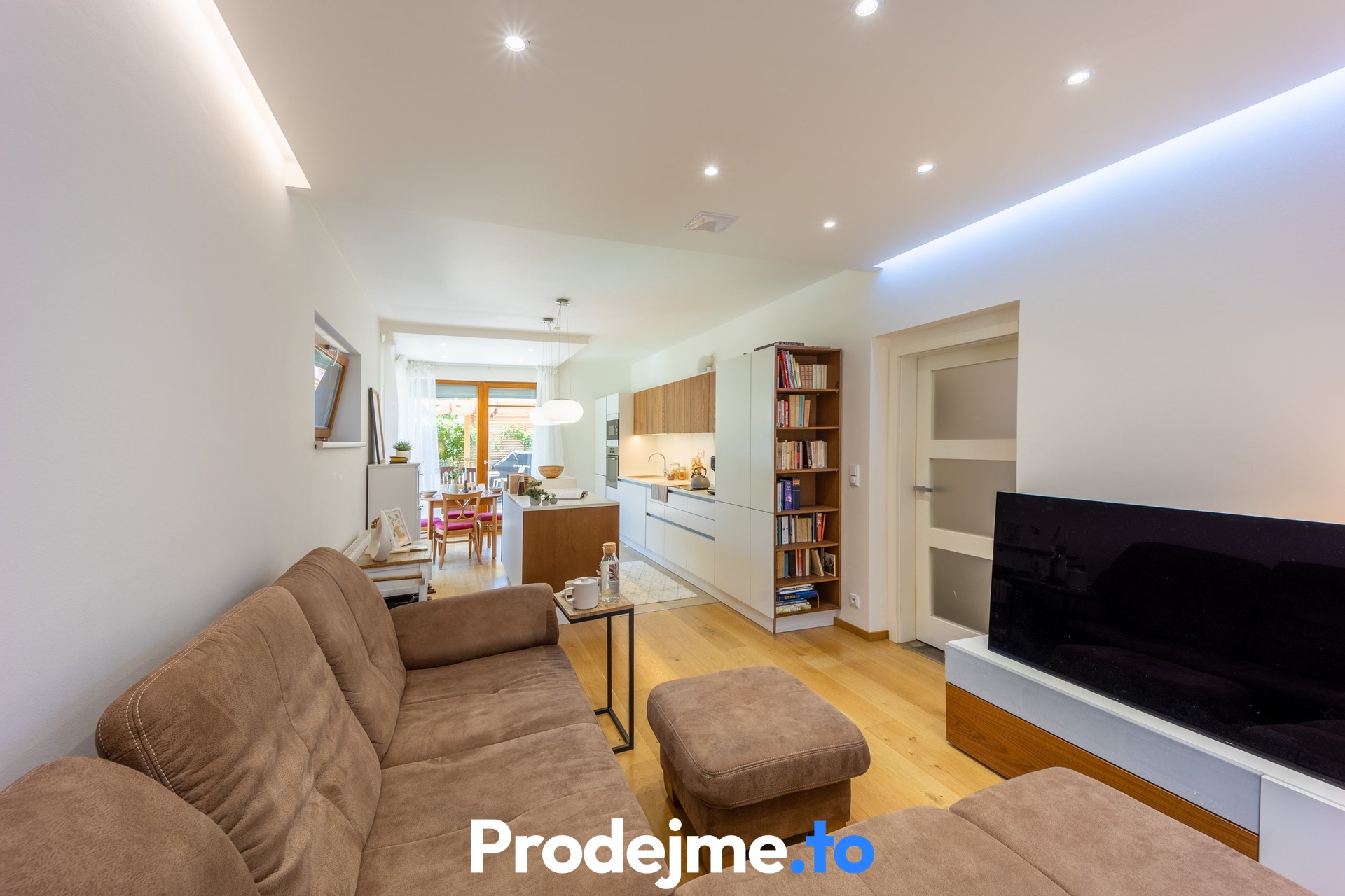 Jako celek ale funguje skvěle, uznejte sami. Vše začíná v obývacím pokoji s velkou kuchyňskou linkou a ostrůvkem. Díky francouzským oknům a vstupům na terasu i do předzahrádky je celý prostor naplněný sluncem. Příjemnou atmosféru díky dostatku denního světla si užijete také v dětském pokoji a ložnici. V té vás potěší vlastní vstup na terasu. Klid na práci vám dopřeje pracovna, kterou ale můžete v případě potřeby snadno využít jako další dětský pokoj. Vkusná koupelna disponuje 2 umyvadly, sprchou a rohovou vanou. Pračku se sušičkou a potřebami pro úklid umístíte do praktické komory. Toalety jsou k dispozici dvě.